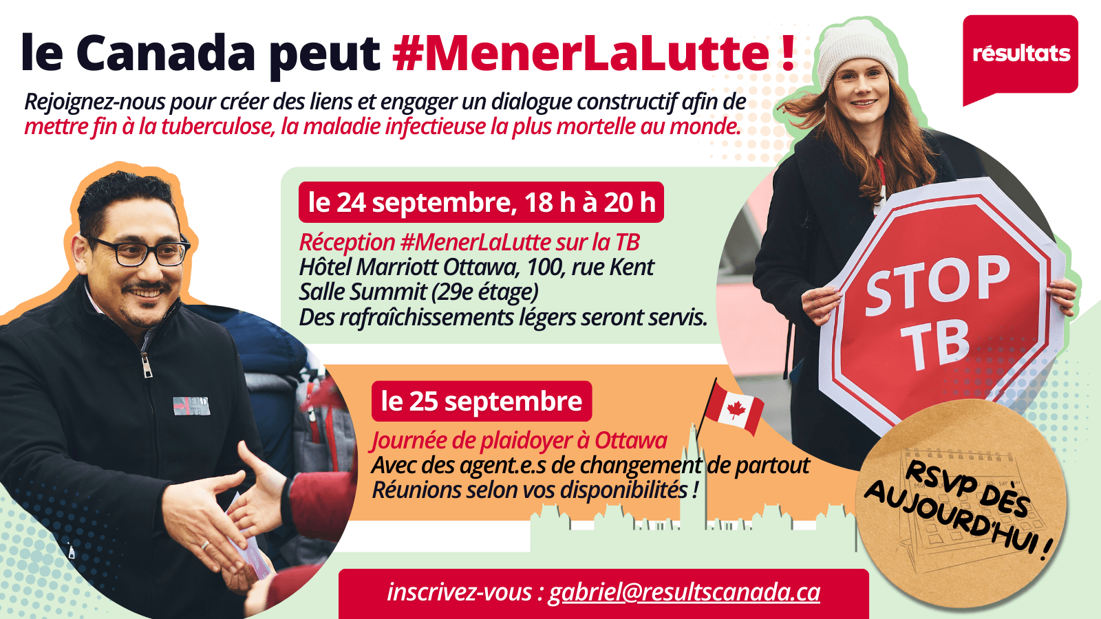 Pour en savoir plus et vous inscrire, veuillez appeler Gabriel de Résultats Canada au 403-715-0048 ou envoyer un courriel à gabriel@resultscanada.ca.