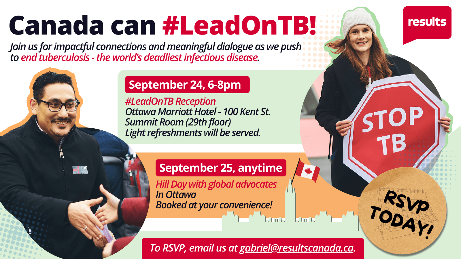 Note that there is also a #LeadOnTB Reception on the eve of the Hill Day. On September 24th from 6-8pm at the Ottawa Marriott, parliamentarians, experts, and people with lived experience of TB both in Canada and abroad will be gathering to discuss TB and build momentum on taking action to eliminate this deadly disease.